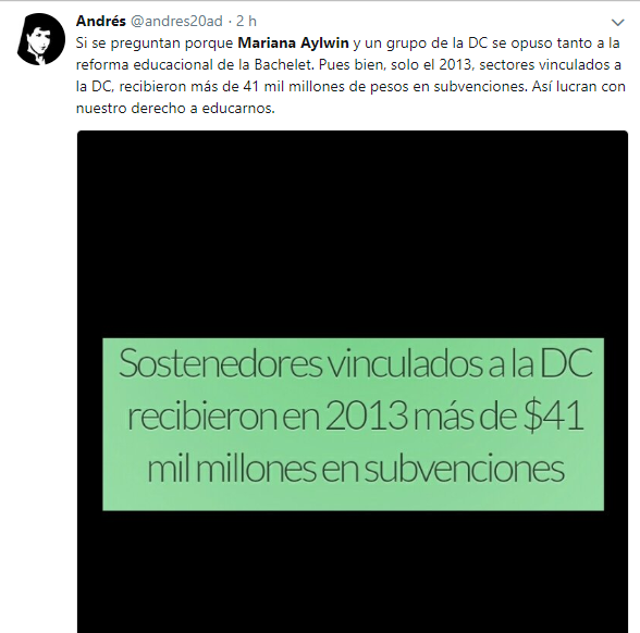 En tanto, el internauta identificado como Andrés sostuvo que “Si se preguntan porque Mariana Aylwin y un grupo de la DC se opuso tanto a la reforma educacional de la Bachelet. Pues bien, solo el 2013, sectores vinculados a la DC, recibieron más de 41 mil millones de pesos en subvenciones. Así lucran con nuestro derecho a educarnos”.