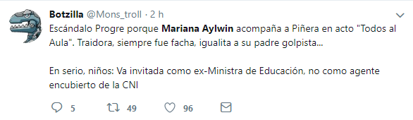 También el tuitero identificado como Botzilla mencionó que “Escándalo Progre porque Mariana Aylwin acompaña a Piñera en acto «Todos al Aula». Traidora, siempre fue facha, igualita a su padre golpista… En serio, niños: Va invitada como ex-Ministra de Educación, no como agente encubierto de la CNI”.