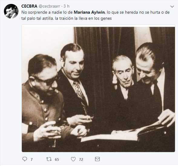 Por su lado, Cecbra señala que “No sorprende a nadie lo de Mariana Aylwin, lo que se hereda no se hurta o de tal palo tal astilla, la traición la lleva en los genes”, agregando una foto en la que aparece el ex Presidente Patricio Aylwin junto al dictador Augusto Pinochet.
