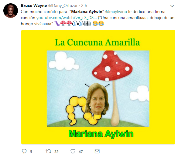 Bruce Wayne dijo que “Con mucho cariñito para «Mariana Aylwin» @maylwino le dedico una tierna canción https://www.youtube.com/watch?v=_c3_D89RsH4 … («Una cuncuna amarillaaaa, debajo de un hongo vivíaaaaa» ) ”, adjuntando la carátula del disco del grupo Mazapán en la que aparece una cuncuna con el rostro de la ex ministra de Educación.