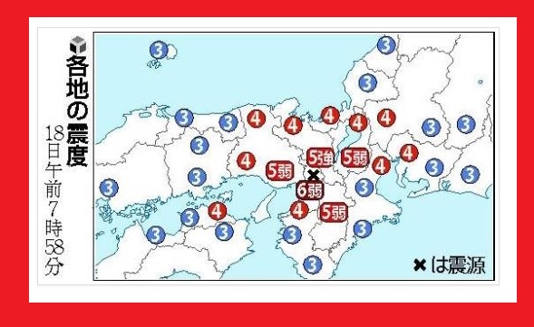Por su parte el diario Yomiuri de señala que el «Terremoto con intensidad inferior a 6 en el norte de Osaka: Hubo un gran terremoto de origen sísmico en la parte norte de la prefectura de Osaka alrededor de las 7:58 a.m. del día 18. Intensidad sísmica 6 débil, Prefectura de Osaka, en el norte, de magnitud 5 en el sur de la prefectura de Kyoto, Shiga Prefecture, el sur de la Prefectura de Hyogo, en el sureste, observe la intensidad sísmica de 5 inferior, tres personas murieron en la prefectura de Osaka se confirmó en la prefectura de Nara. No hay preocupación por el tsunami causado por este terremoto. Además de la ocurrencia de apagones en varios lugares, el Sanyo Shinkansen y el Tokaido Shinkansen se interrumpen y hay efectos. El gobierno estableció una oficina de contramedidas en la residencia oficial del primer ministro».