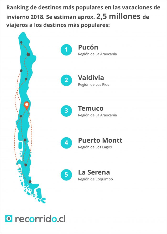 Dentro de lo que se ha podido observar en la demanda del sitio web de Recorrido.cl es que los chilenos siguen prefiriendo el sur del país como un destino ideal para pasar unos días de descanso. Así, Temuco, Valdivia y Puerto Montt no dejan de recibir turistas, pues sin importar el clima, sus paisajes, panoramas y gastronomía siguen cautivando a los viajeros en estas vacaciones. Mientras que para aquellos deseosos de aplacar un poco las bajas temperaturas, la zona norte sigue siendo una opción, donde La Serena se posiciona como una de las ciudades más requeridas.
