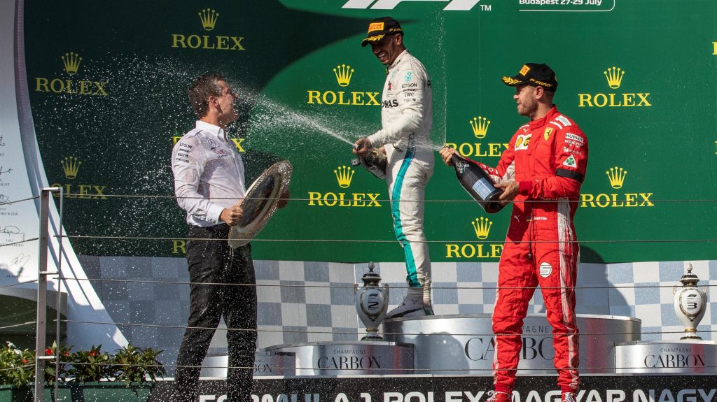 Lewis Hamilton (GBR) Mercedes-AMG F1 y Sebastian Vettel (GER) Ferrari celebran en el podio con el champán en el Campeonato Mundial de Fórmula Uno, Rd12, Gran Premio de Hungría, Carrera, Hungaroring, Hungría, el domingo 29 de julio de 2018. © Manuel Goria / Imágenes de Sutton/F1