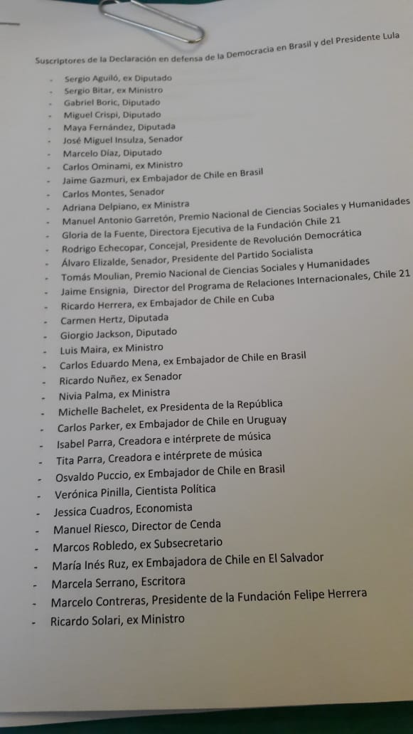 Otro de los firmantes, Jaime Gazmuri, planteó que “nos ha parecido dar esta opinión, vamos a construir con estas personalidades un comité de solidaridad con Brasil y Lula y desarrollaremos distintas iniciativas en un movimiento que no es sólo chileno, sino muchas voces en América Latina están manifestando en otra situación”.