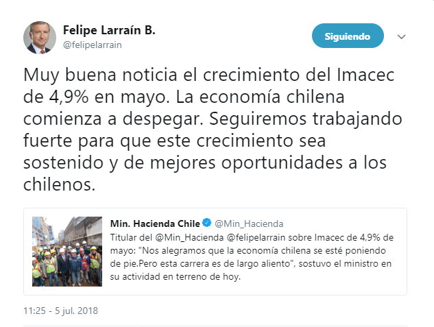 A través de su cuenta personal en Twitter, el secretario de Estado dijo que «muy buena noticia el crecimiento del Imacec de 4,9% en mayo. La economía chilena comienza a despegar. Seguiremos trabajando fuerte para que este crecimiento sea sostenido y de mejores oportunidades a los chilenos«.