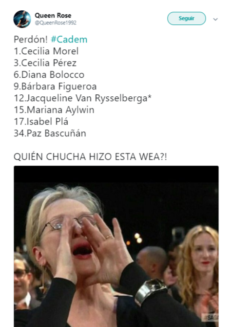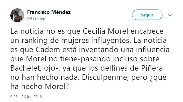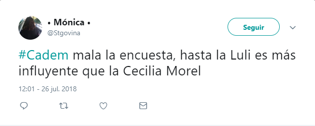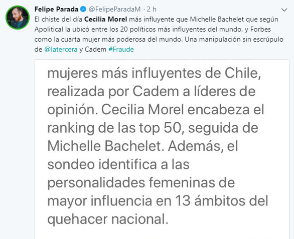 Luego que hoy se diera a conocer el resultado de la encuesta La Tercera-Cadem y que muestra que la Primera Dama Cecilia Morel es la mujer más influyente del país, las redes sociales no se hicieron esperar y cuestionaron la veracidad del sondeo como también la calidad de la empresa a cargo del estudio.