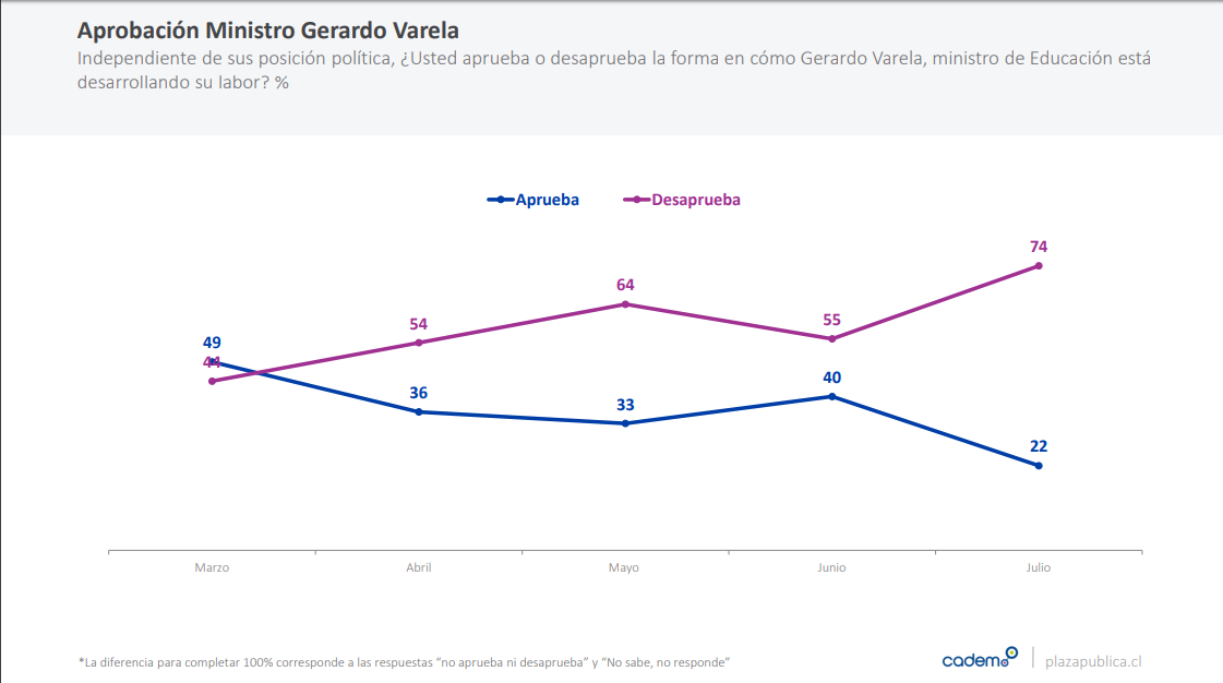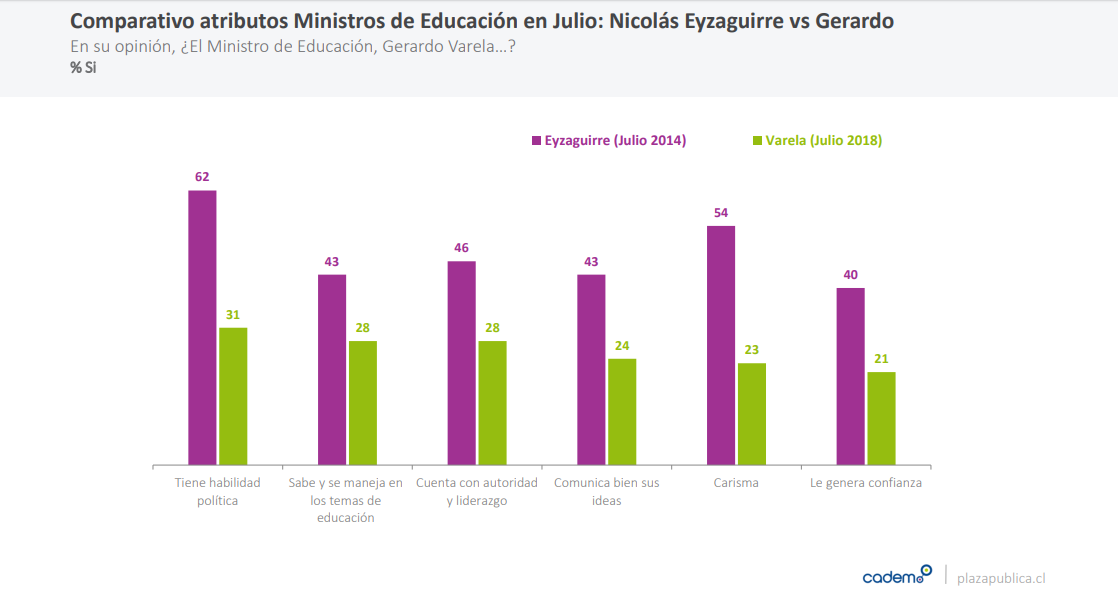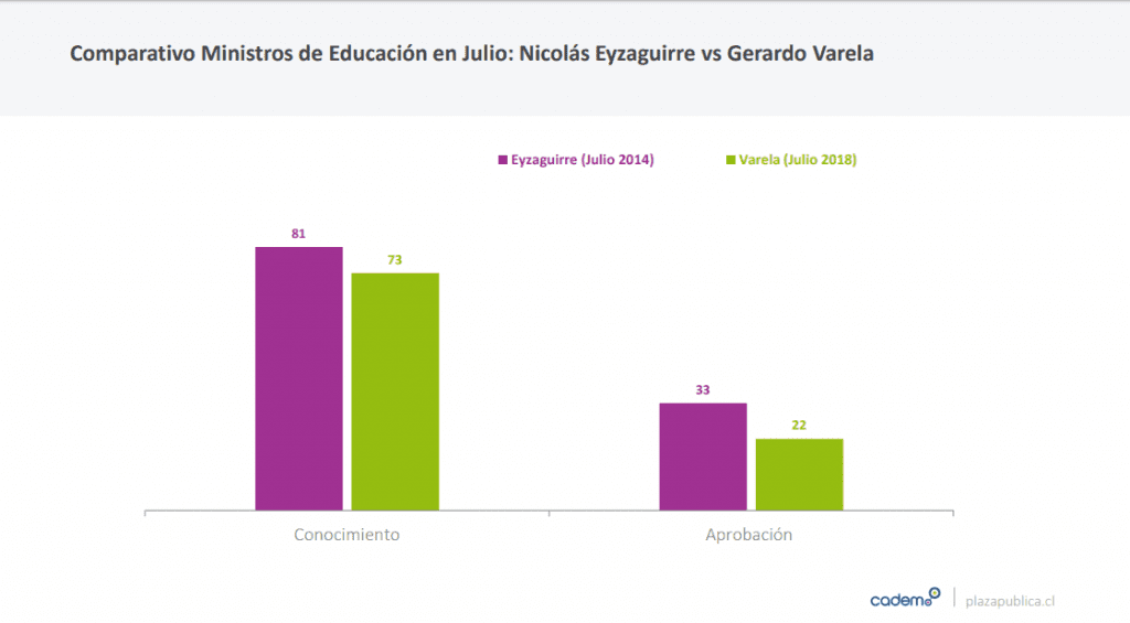 Además, el sondeo hace una comparación con el ex ministro de Educación, Nicolás Eyzaguirre, en cuanto a la aprobación, tomando en cuenta el mismo mes pero de 2014, indicando que el ex titular del Mineduc tenía un 33% de aprobación, mientras que Varela logra un 22%.