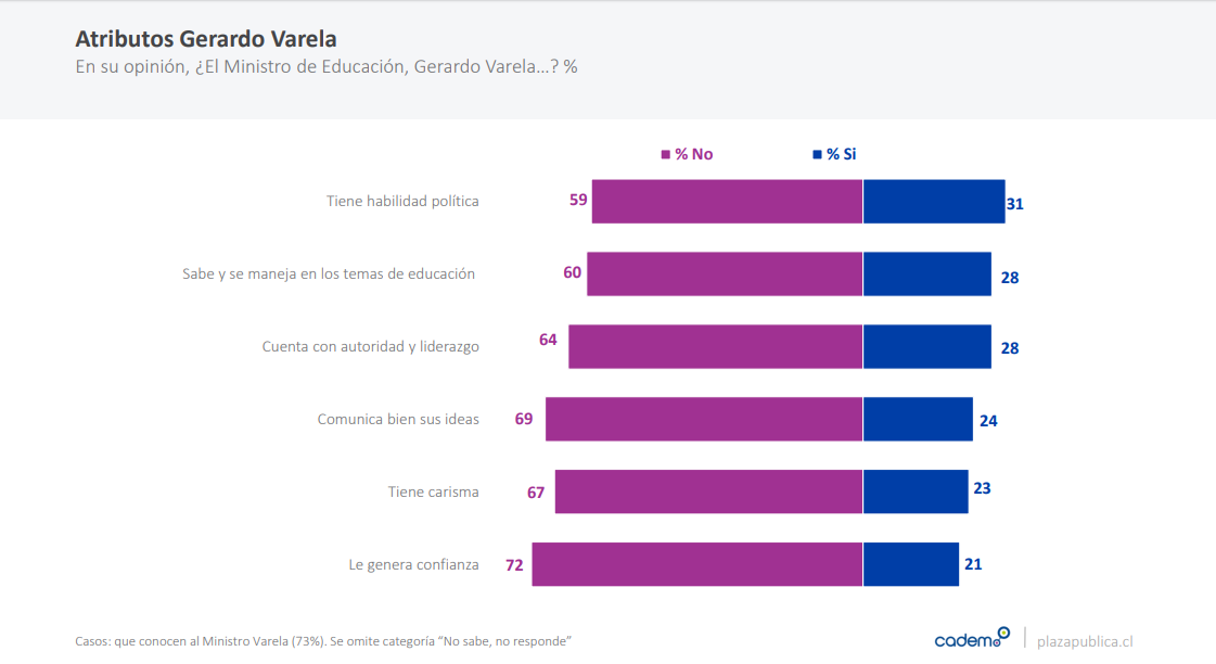 Respecto a lo atributos del titular del Mineduc, un 59% dice que no tiene habilidad política, un 60% señala que no sabe y maneja los temas de educación, un 69% cree que no comunica bien sus ideas, un 67% que no tiene carisma y un 72% que no genera confianza.