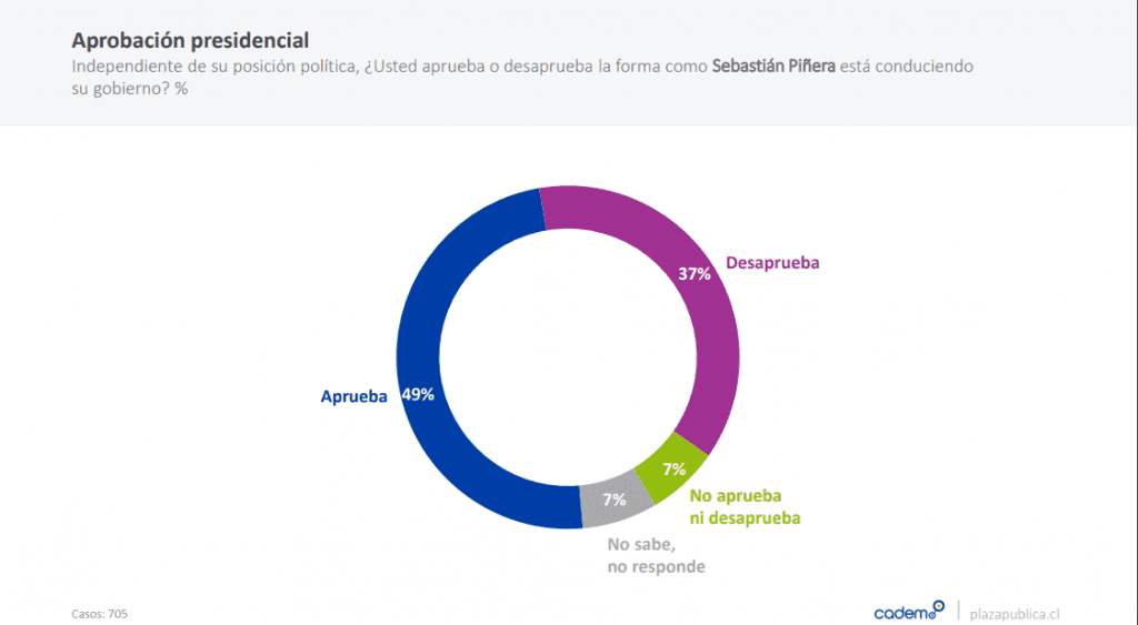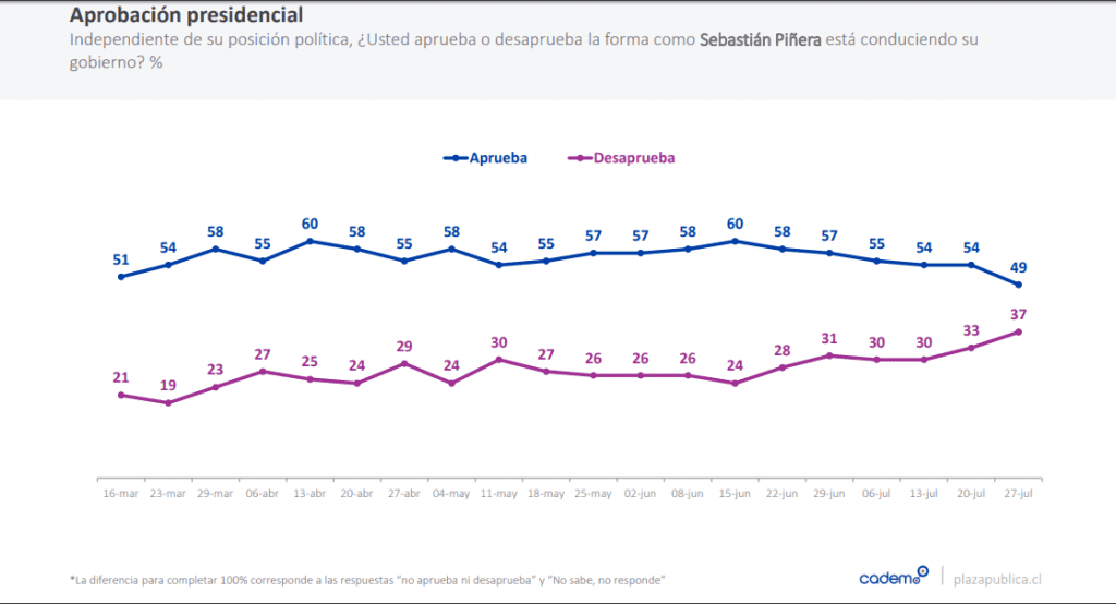 En la cuarta y última semana de julio, un 49% aprueba la gestión del Presidente Piñera, 5 puntos menos con respecto a la última semana y 11 puntos menos en comparación a la semana del 15 de junio cuando registraba su punto más alto (60%). En este contexto, julio se convierte en el peor mes desde el inicio del segundo gobierno con una desaprobación que se alza a un 37%.