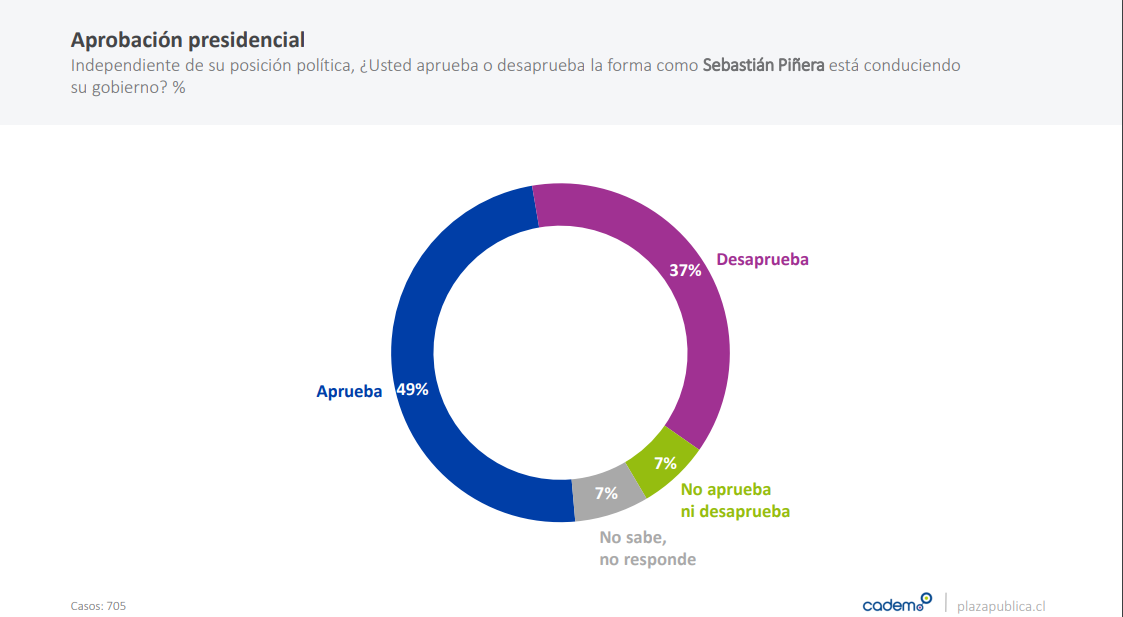 Esta baja del secretario de Estado también repercute negativamente la imagen del Presidente Sebastián Piñera, que cae 5 puntos y llega a un 49% de aprobación desde el 54% obtenido en el sondeo anterior, la peor evaluación de su segundo gobierno.