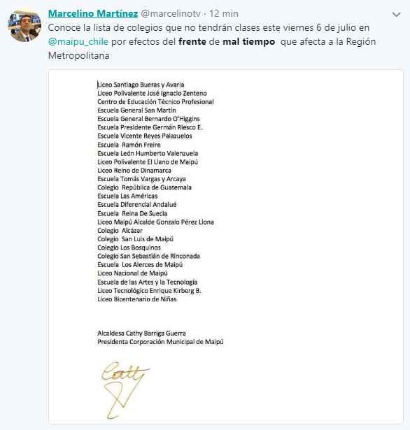 En tanto, la alcaldesa de Maipú, Cathy Barriga, decidió suspender las clases en los colegios municipales de su comuna por seguridad de los escolares ante el paso del sistema frontal que afecta a la Región Metropolitana.
