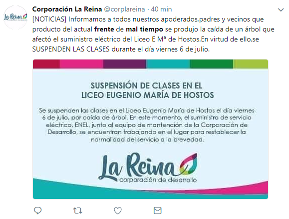 Su anuncio lo hizo a través de su cuenta en Instagram, donde también llamó a los colegios particulares a que se sumen a esta suspensión de las actividades académicas, ya que no posee atribuciones para tomar la decisión de todos los establecimientos de la comuna.