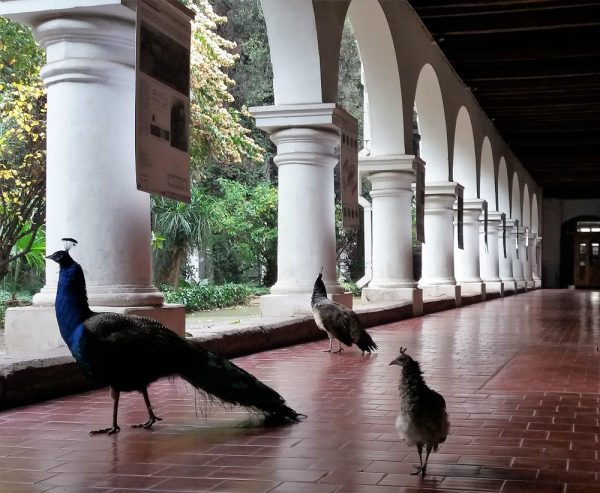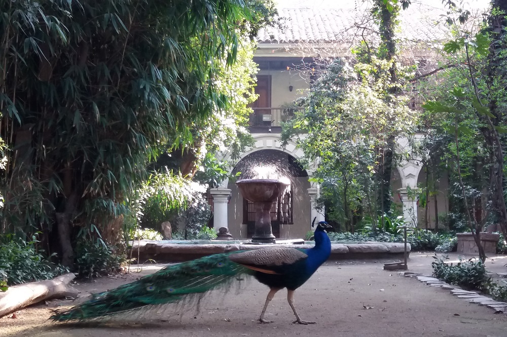 El jardín colonial es un oasis en el corazón de Santiago, dados su mucha vegetación y estos animalitos viviendo de manera silvestre. Las aves son Crisóstomo y Clarita, una pareja de pavos reales que cada tanto crían pavitos, los que son regalados al crecer, y Moisés y Antonio, padre e hijo gallitos de la pasión. En la pileta a su vez vive una treintena de peces de colores y una tortuga que eventualmente sale de la tierra para habitar en ella. Este espacio es parte de la espiritualidad franciscana y genera mucha paz y alegría entre los visitantes.