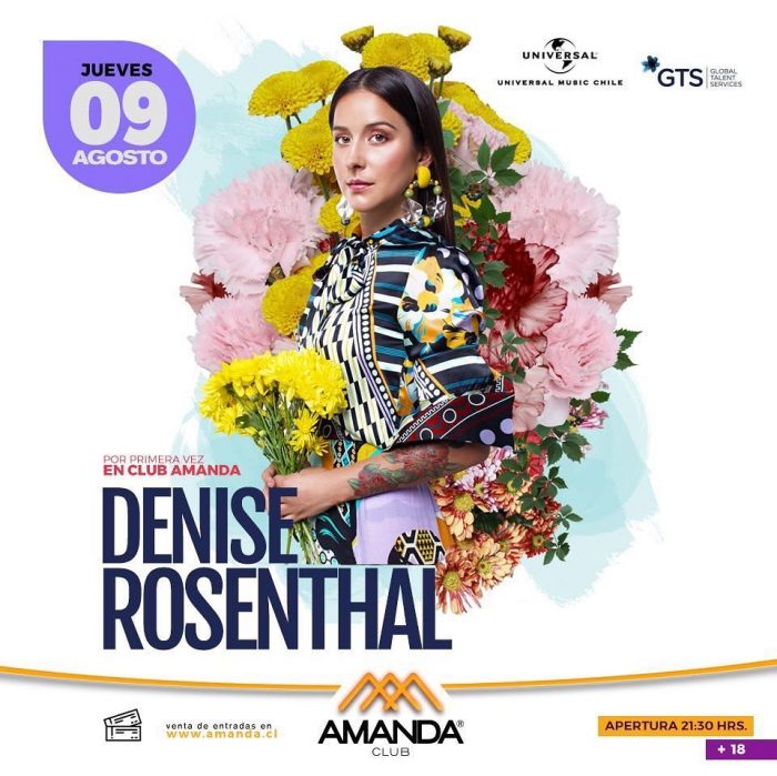 El imperdible concierto de Denise Rosenthal, donde además lanzará el video clip de “Lucha en equilibrio”, se realizará el jueves 9 de agosto en el Club Amanda, ubicado en Embajador Doussinague 1767, Vitacura. Valor de las entradas $9.000, a la venta a través del sistema Passline