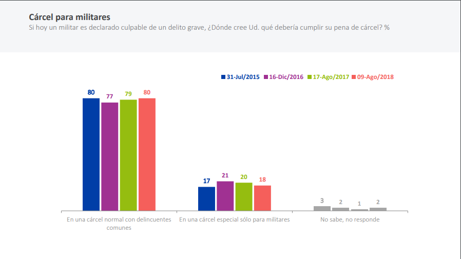 Asimismo, el estudio precisa que un 80% establece que si un militar es declarado culpable de un delito grave, este debe ir a una cárcel normal con delincuentes comunes, mientras que un 18% dice que debería ir a una cárcel especial sólo para uniformados.