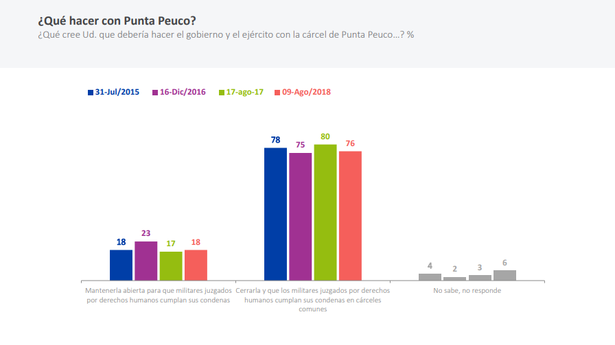 El sondeo de opinión se hizo en medio de una semana en que se instaló un debate respecto a la liberación de ex uniformados de la cárcel de Punta Peuco, arrojando también que un 76% dice que el gobierno y el Ejército deberían cerrar esta cárcel y que los militares juzgados por DD.HH deberían cumplir sus condenas en cárceles comunes, mientras que sólo un 18% señala que cree que deberían mantenerla abierta.