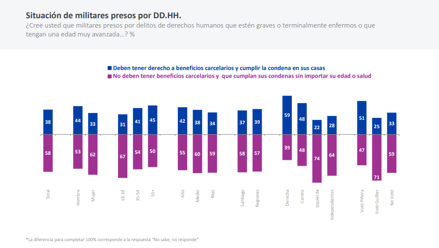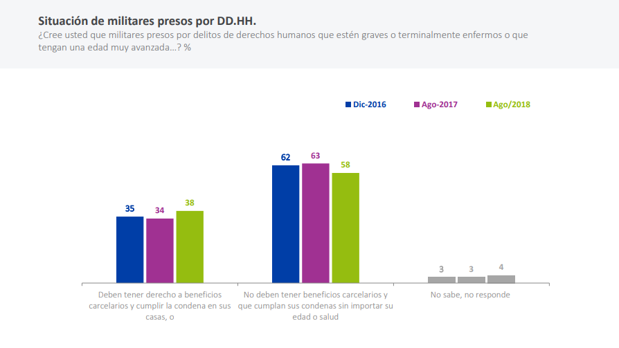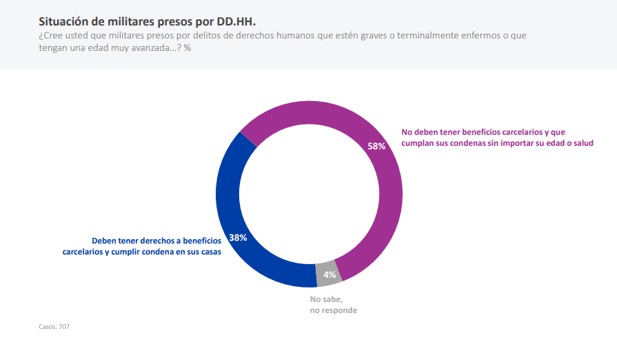 La encuesta también menciona que a los militares presos por delitos de derechos humanos que estén graves o terminalmente enfermos y/o que tengan una edad muy avanzada, un 58% establece que no deben tener beneficios carcelarios y que deben cumplir sus condenas sin importar su edad o salud, mientras un 38% afirma que deben tener derechos a beneficios carcelarios y cumplir condena en sus casas.