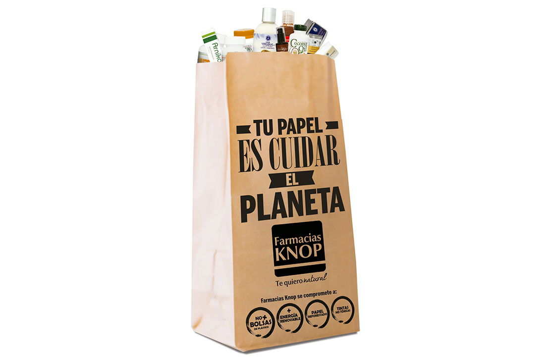 Consientes del daño que el plástico provoca en nuestro país y en el mundo y del papel crucial que juegan los locales de Farmacias KNOP como ejemplo de preservación de lo natural, desde el 02 de enero de este año eliminó el 100% de la entrega de bolsas plásticas a los clientes, reemplazándolas por bolsas de papel provenientes de bosques reforestados.