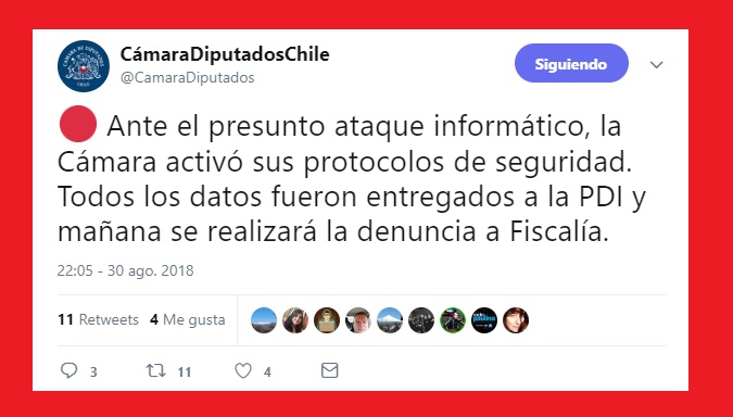 A las 22:05 de la noche de este jueves la Cámara de Diputados,a través de su cuenta oficial en Twitter confirmó que: «Ante el presunto ataque informático, la Cámara activó sus protocolos de seguridad. Todos los datos fueron entregados a la PDI y mañana se realizará la denuncia a Fiscalía».