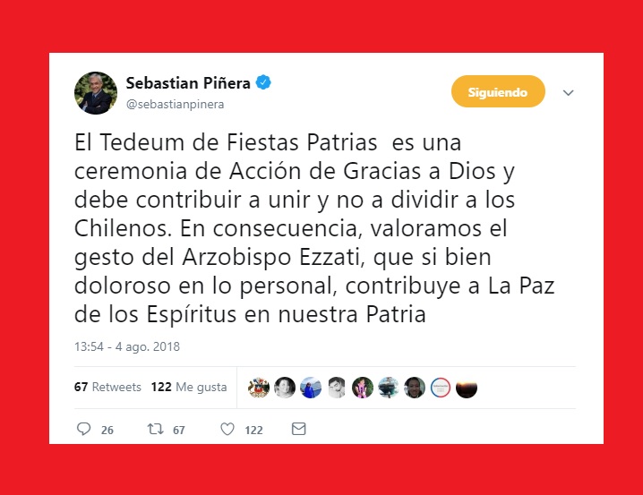 Pero, a las 13:51 horas de la tarde de este sábado, el jefe de Estado sí reaccionó vía Twitter señalando: «El Tedeum de Fiestas Patrias es una ceremonia de Acción de Gracias a Dios y debe contribuir a unir y no a dividir a los Chilenos. En consecuencia, valoramos el gesto del Arzobispo Ezzati, que si bien doloroso en lo personal, contribuye a La Paz de los Espíritus en nuestra Patria» (13:54 – 4 ago. 2018).
