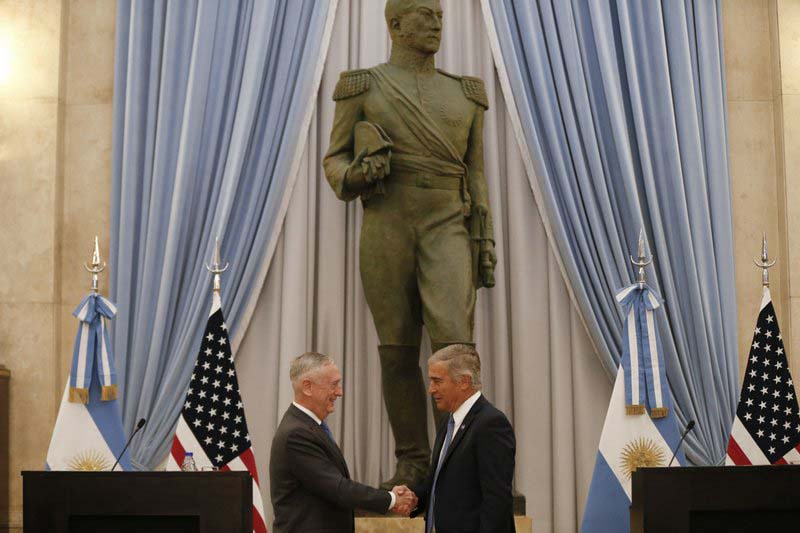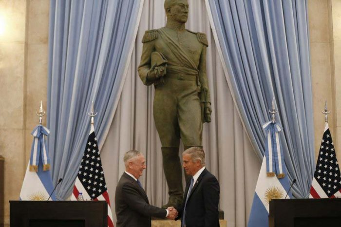 Este miércoles Secretario de Defensa de los Estados Unidos, Jim Mattis sostuvo una histórica reunión con las autoridades argentinas tras 15 años de estancamientos de las relaciones a nivel de Defensa. Mattis señaló que Estados Unidos trabajará más estrechamente con Argentina y los militares estadounidenses y argentinos buscarán una cooperación más estrecha en varios frentes, incluida la educación y entrenamiento militar. Ahora llegó a Chile.