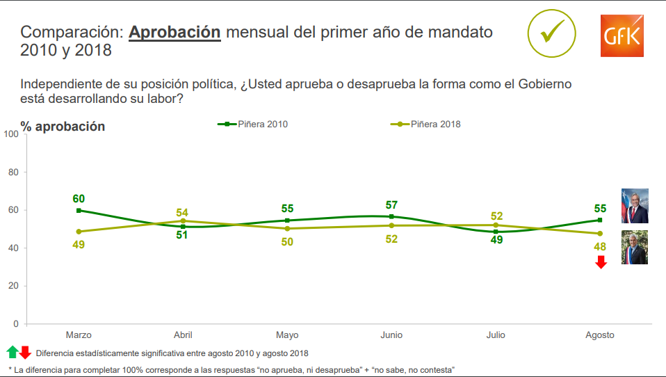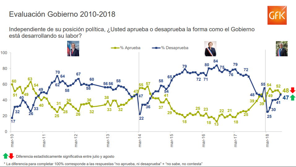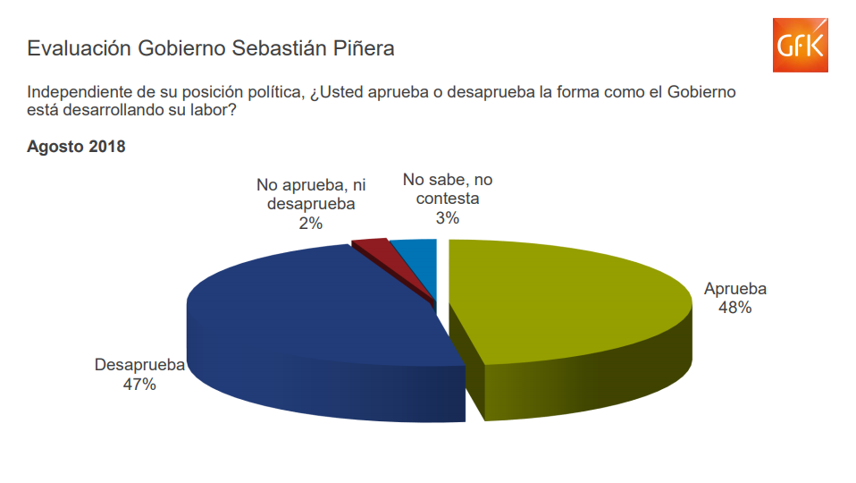 Según el sondeo de agosto, el mandato del gobierno que encabeza el Presidente Sebastián Piñera concluyó con un 48% de aprobación y un 47% de desaprobación.