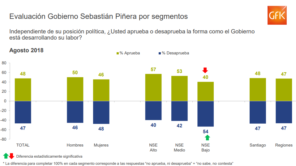 En cuanto a los segmentos sociales, la aprobación del gobierno de Piñera alcanza un 40% de aprobación en el nivel socioeconómico bajo, mientras que en el nivel medio es 53% y en el alto 57%.