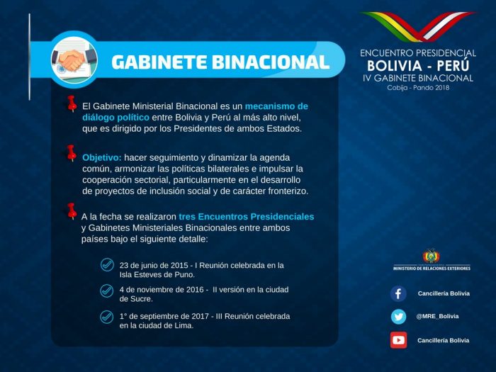 El Gabinete Binacional Bolivia-Perú constituye un mecanismo de diálogo político bilateral al más alto nivel.