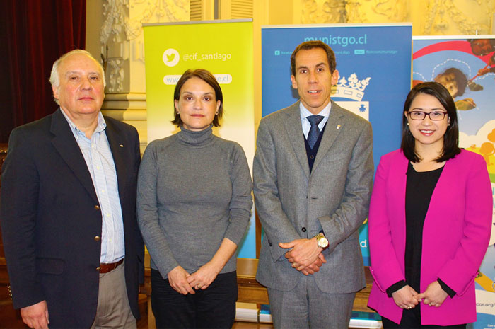 Al centro, el Alcalde Alessandri, acompañado del presidente de Fundación Arcor Chile, Leopoldo Valdés; y de las directoras ejecutivas del Comité para la Infancia y Familia de la Municipalidad de Santiago, Paula Jaramillo y de la Fundación Arcor Chile, María Laura Berner.