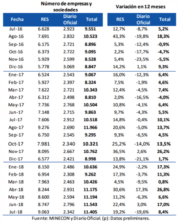 En el mes de julio de 2018 se constituyeron 11.405 empresas y sociedades en el país. De las cuales el 79,5% se hizo a través del Registro de Empresas y Sociedades (RES) y el 20,5% restante, a través del Diario Oficial, según el informe Radar Pyme de RedCapital. Las regiones que lideraron la creación de nuevas firmas en base al sistema RES, fueron la Región Metropolitana con 4.169 empresas (46%), Valparaíso con 903 firmas (10,5%) y Biobío con 743 nuevas firmas (8,2%). Por otro lado, Arica y Parinacota, y Aysén registraron 108 y 81 nuevas empresas, respectivamente, siendo las zonas con menor tasa de emprendimientos del país.