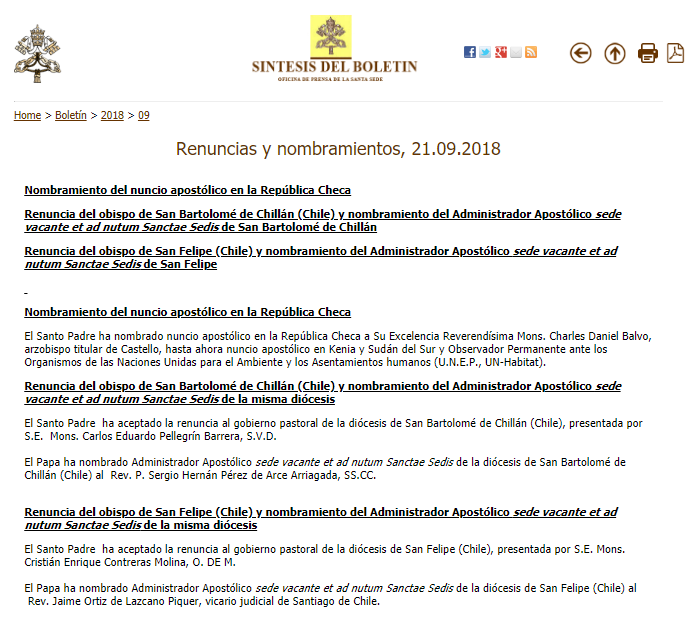 El Vaticano dio a conocer que en reemplazo del obispo de Chillán asumirá como administrador apostólico Sergio Pérez de Arce Arriagada, quien actualmente se desempeña como rector de la Iglesia de los Sagrados Corazones de Valparaíso y quien tendrá que recibir las denuncias de abusos sexuales.