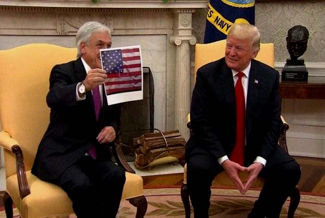 Este viernes el Presidente Sebastián Piñera, hizo gala de su “ingenio” al mostrar una supuesta bandera norteamericana en la que se podía ver que también está la bandera de Chile, pero esa imagen está totalmente trucada, de hecho así lo deja entrever el propio jefe de Estado al explicar: «Con un pequeño cambio en la bandera americana uno puede decir que Chile está en el corazón de Estados Unidos. Como la bandera americana tiene estrellas y tiene franjas rojas y azul uno puede hacer con una pequeña dosis de ingenio, afirmar, que Chile está en el corazón de Estados Unidos y se lo mostré al Presidente Trump».