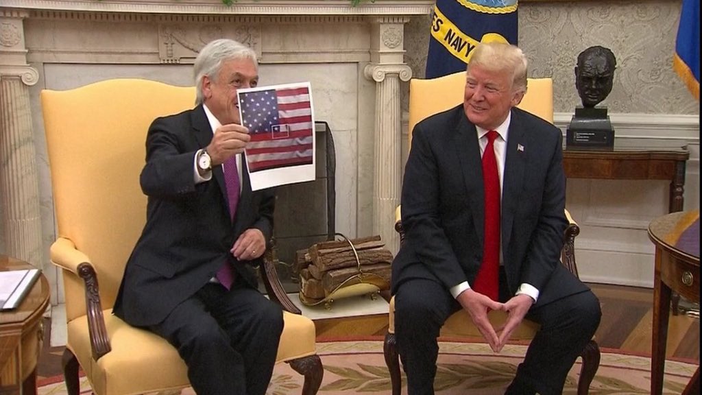 «A propósito Chile está en el corazón de Estados Unidos y además está la bandera chilena justo en el corazón de la bandera de Estados Unidos», fue la frase que dijo el Presidente, Sebastián Piñera, un segundo antes de sacar una imagen impresa que refleja una bandera chilena dentro de la de Estados Unidos.