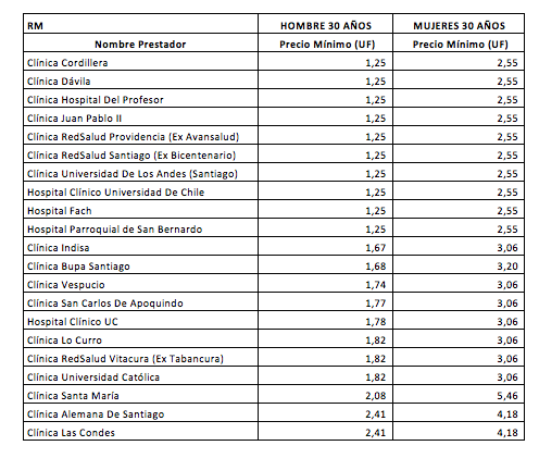 En el caso de una mujer, el listado de las más económicas lo encabezan las mismas clínicas que para hombres, pero con un precio desde de 2,55 UF. Las más costosas son la Clínica Alemana de Santiago y Clínica Las Condes, también con el mismo precio de acceso (4,18 UF).