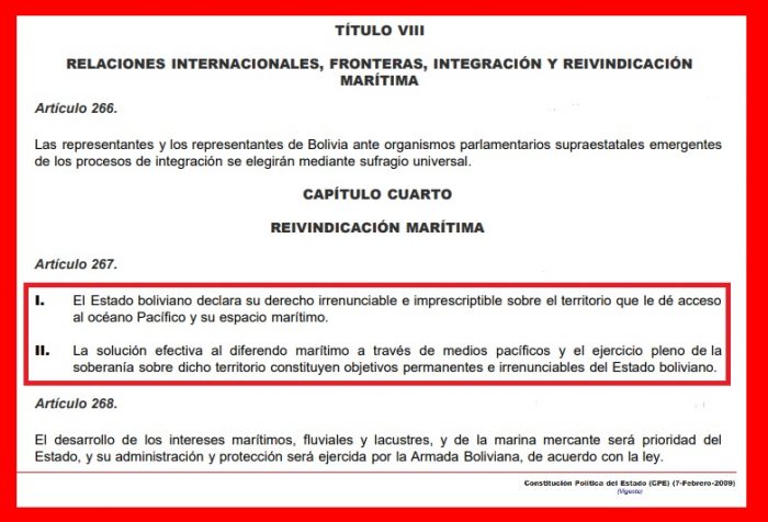 Para los que no han leído la Constitución e Bolivia, en su Título VIII aborda el tema marítimo: “Relaciones internacionales, fronteras, integración y reivindicación Marítima” y es en el “Capítulo cuarto” donde ser refiere directa y claramente a la “Reivindicación marítima: Artículo 267.