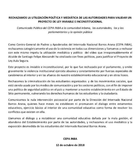 El Centro de Padres y Apoderados del Internado Nacional Barros Arana (CEPA-INBA) salió este viernes a rechazar la violencia “en todas sus formas”, cuestionando a su vez el uso mediático que está haciendo el alcalde de Santiago, Felipe Alessandri, del video donde aparece un carabinero siendo agredido por estudiantes con la intención de justificar el proyecto Aula Segura.