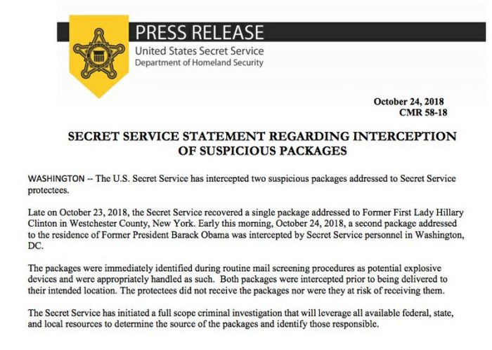 El Servicio Secreto de los Estados Unidos dice que los agentes han interceptado paquetes que contienen «posibles dispositivos explosivos» dirigidos al ex presidente Barack Obama y Hillary Clinton. (24 de octubre)