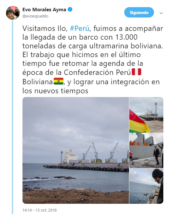 La nota oficial de la cadena ERBOL señala: «El Presidente Evo Morales visitó este sábado el puerto peruano de Ilo para acompañar la recepción de 13 mil toneladas de carga boliviana y luego asistir a actos protocolares, donde fue declarado «Personaje Ilustre» por el alcalde de Ilo William Valdivia.