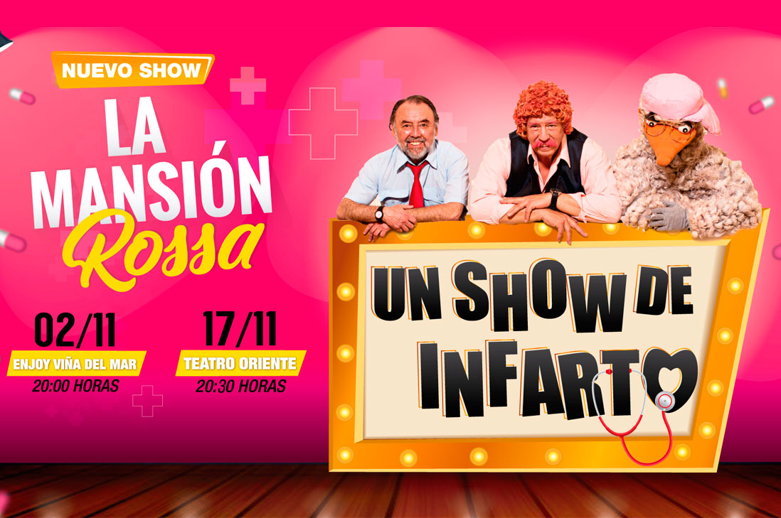 El trío más querido de Chile, compuesto por el Profesor Rossa, Don Carter y Guru Guru, vuelve a los escenarios para presentar un nuevo espectáculo de La Mansión Rossa. Este renovado show de humor se presentará en dos funciones, los días 2 de noviembre en el Enjoy de Viña del Mar y el 17 del mismo mes en el Teatro Oriente.