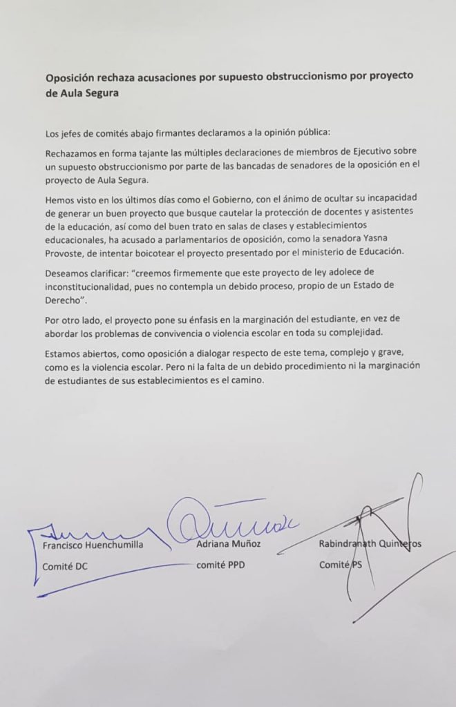 A través de una carta firmada por los tres jefes de bancada de la ex Nueva Mayoría del Senado, se realizó una defensa corporativa a la senadora DC y presidenta de la comisión de Educación, Yasna Provoste, que respetó el reglamento y no revisó el proyecto de Aula Segura hasta que llegara el informe de la Comisión de Constitución, tema que fue acusado de obstruccionismo por el Gobierno y el oficialismo.