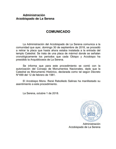 De acuerdo a un comunicado emitido por el mencionado arzobispado, desde ayer domingo la placa instalada a la entrada del templo, indicando que se trata de “una placa de mármol donde se señalan cronológicamente los periodos de cada Obispo y Arzobispo ha presidido la Arquidiócesis de La Serena”.