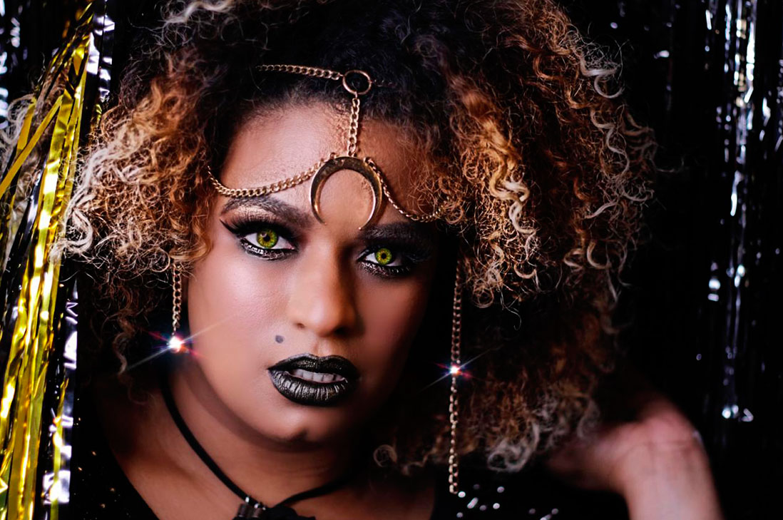 5. Para complementar el look, usamos un accesorio en nuestra frente referente a la temática, podemos dibujar un lunar falso con delineador y con unos lentes de contacto verdes terminamos de lograr el look de Bruja Glam. ¡Y voilla!