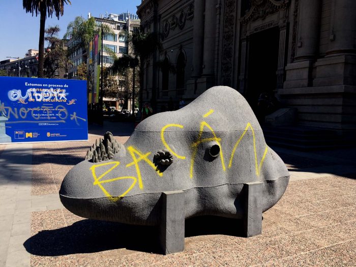 Desde el miércoles (3 octubre, la escultura “La Patata” (que más bien parece una alegoría a un rinoceronte) del premio nacional de Artes 2009, Federico Assler, apareció rayada con letras amarillas: En un costado se puede leer “B A C A N”, la escultura está ubicada en la explanada de acceso principal al Museo Nacional de Bellas Artes y a un costado de la también dañada escultura de Rebeca Matte que está en proceso de restauración.