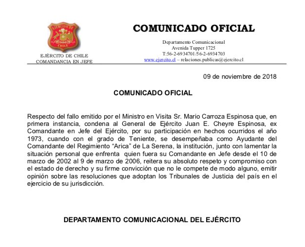 Respecto del fallo emitido por el Ministro en Visita Sr. Mario Carroza Espinosa que, en primera instancia, condena al General de Ejército Juan E. Cheyre Espinosa, ex Comandante en Jefe del Ejército, por su participación en hechos ocurridos el año 1973, cuando con el grado de Teniente, se desempeñaba como Ayudante del Comandante del Regimiento “Arica” de La Serena”, menciona el texto.
