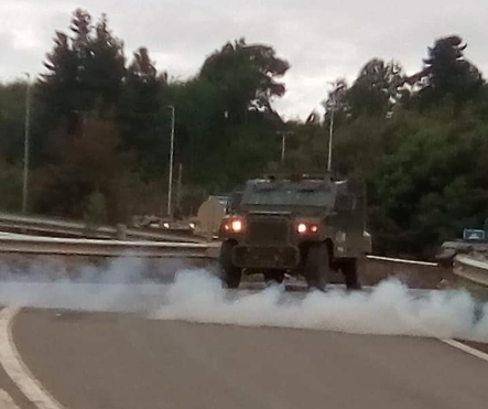 En la comuna de Ercilla, personal del GOPE llegó junto a carros policiales a resguardar las viviendas de sus colegas, respondiendo las agresiones con lanzamiento de bombas lacrimógenas y uso de armamento de fuego.