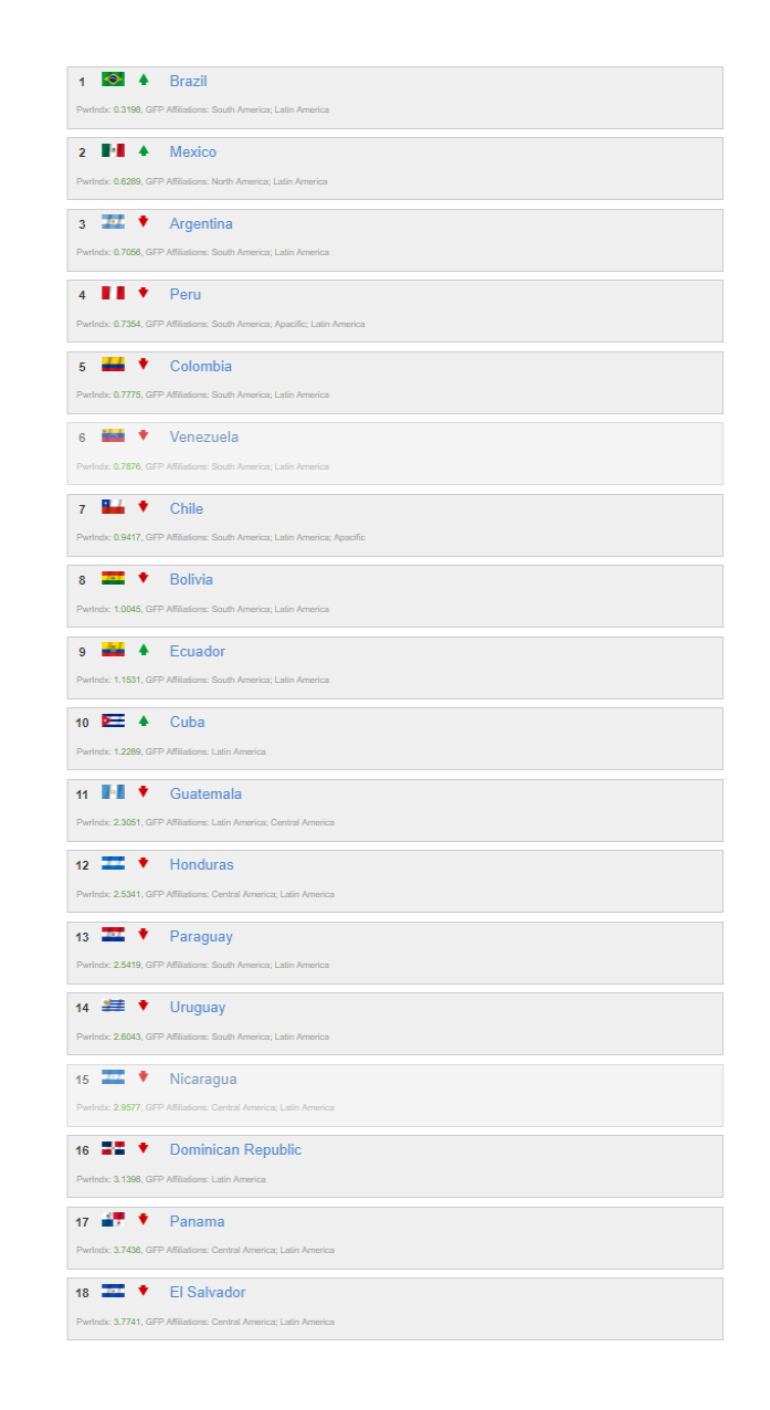En la lista de este año, solo una nación de Latinoamérica logra posicionarse entre las 20 mayores potencias mundiales: Brasil, en el puesto 14. Argentina aparece en el lugar 37.