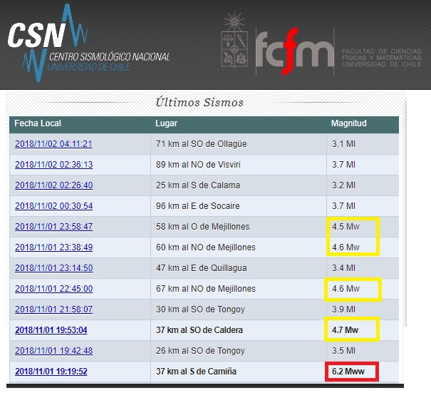 Este jueves 1 de noviembre se produjo un sismo mayor de 6,2° Richter en la región de Atacama y fue percibido en todo el Norte Grande del país, no se produjeron daños, solo derrumbes en algunas rutas según informó Carabineros y tampoco hubo riesgo de tsunami. Pero entre ese sismo, que para otros países serían terremotos y habrían caudado devastación, se ha se han registrado once temblores de diversas intensidades que no superan los 4,7° Richter, según informa el Centro Sismológico Nacional de la Universidad de Chile.