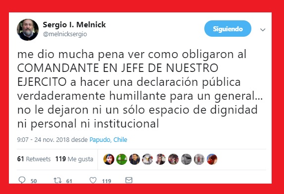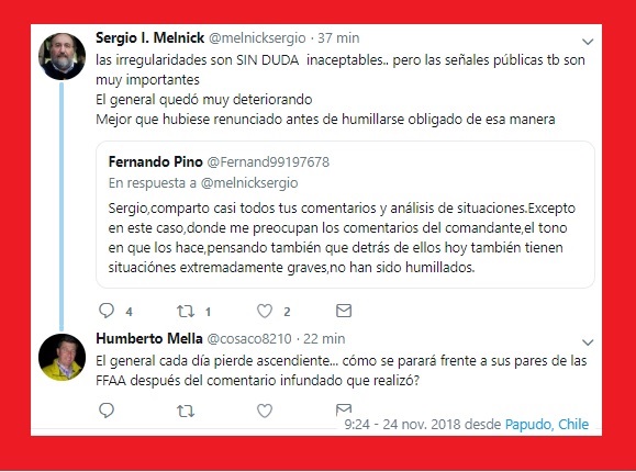 Entre los tuits más arteros está el del amigo y considerado uno de los «orejeros» de Piñera, el aprendiz de mago -autodefinición- Sergio Menlick que en una tuitera-conversación plantea que el máximo jefe militar debería renunciar: «las irregularidades son SIN DUDA inaceptables.. pero las señales públicas tb son muy importantes. El general quedó muy deteriorando. Mejor que hubiese renunciado antes de humillarse obligado de esa manera». (09:24 Hrs.)