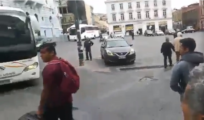 La grabación de 1:39 minutos los muestran bajando las escaleras y siendo “invitados” a abandonar el edificio, para luego alejarse por la Plaza Sotomayor acompañado de gritos de “sapos”.
