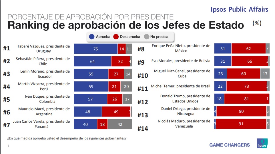 El estudio muestra que los mandatarios con imagen más favorables entre los líderes de opinión de la región son el de Uruguay con un 76%, luego viene Piñera con un 64%, detrás Lenin Moreno de Ecuador con 59% y Martín Vizcarra de Perú con 59%.